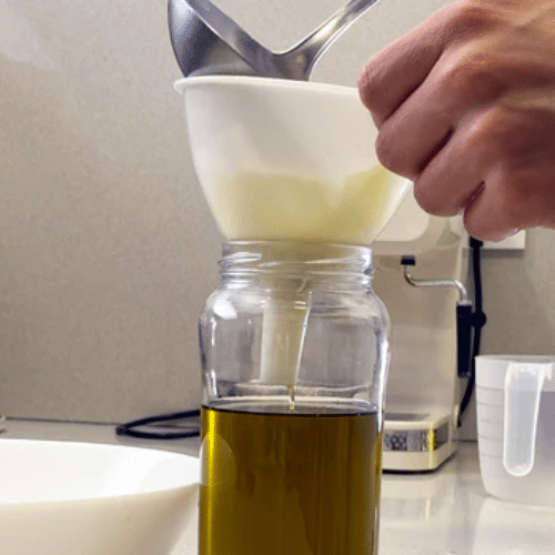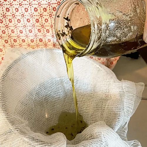 - Filtra y conserva: cuela el aceite con una gasa fina y guárdalo en un frasco ámbar.