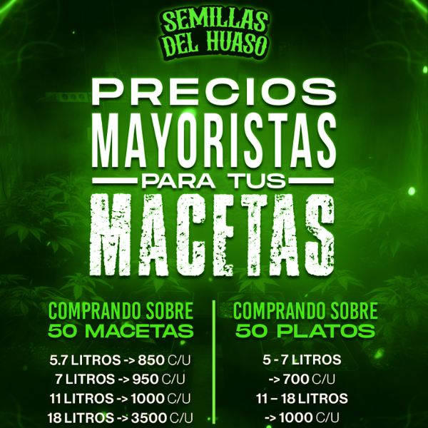 Encuentra la maceta perfecta para tus plantas en Semillas del Huaso! Descubre nuestra amplia selección de macetas en diferentes tamaños y materiales para satisfacer todas tus necesidades de cultivo. Ya sea que estés cultivando en interiores o exteriores, nuestras macetas están diseñadas para proporcionar el ambiente ideal para el crecimiento de tus plantas. Desde macetas de plástico hasta macetas de tela transpirable, tenemos opciones para todos los cultivadores. Asegúrate de elegir la maceta adecuada para tus plantas y maximiza su crecimiento y rendimiento. ¡Explora nuestra colección de macetas en Semillas del Huaso y comienza tu cultivo con el pie derecho!
