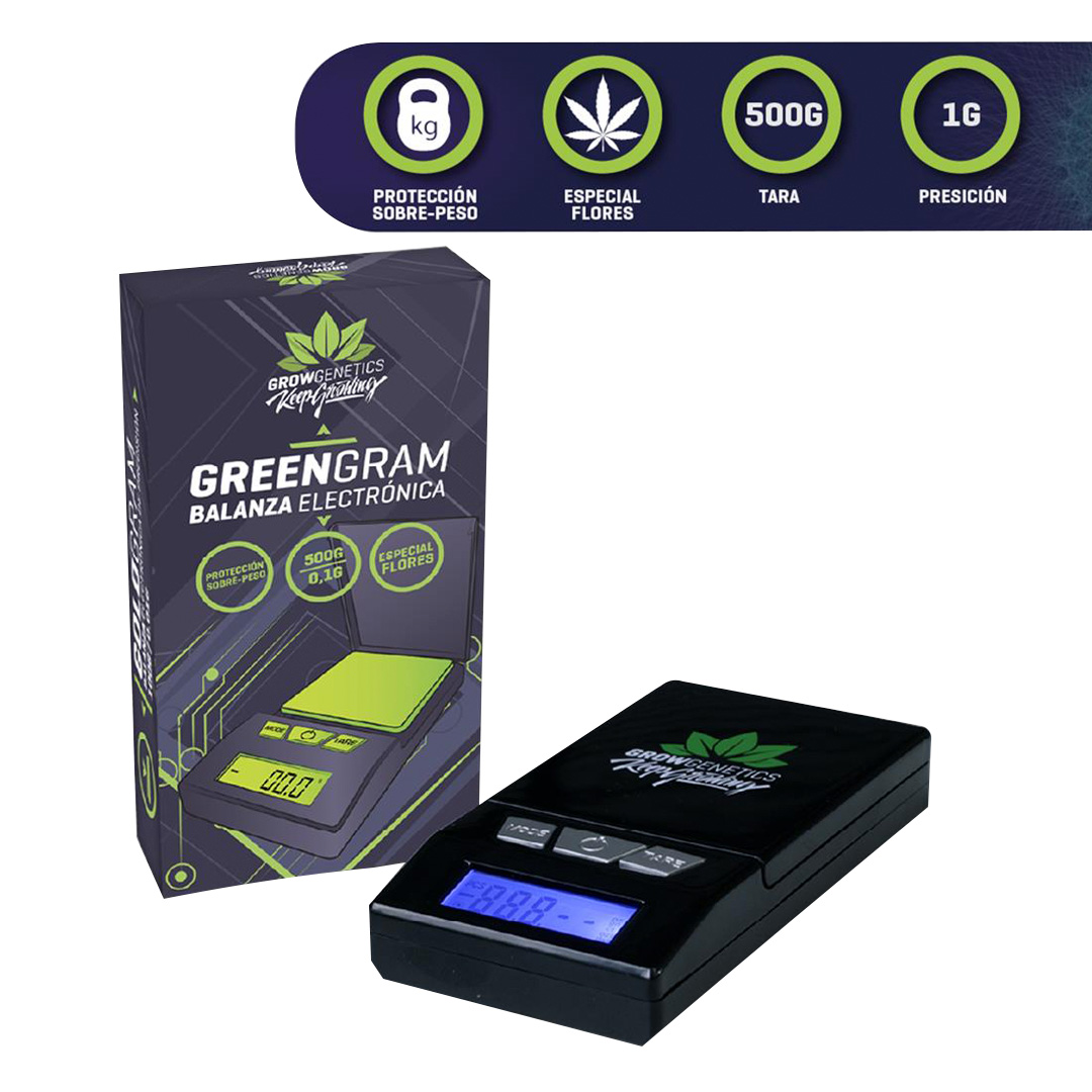 Balanza digital Green Gram Grow Genetics con capacidad de hasta 500 g. Compacta, liviana y precisa, con función tare, autocalibración y diferentes unidades de medición.