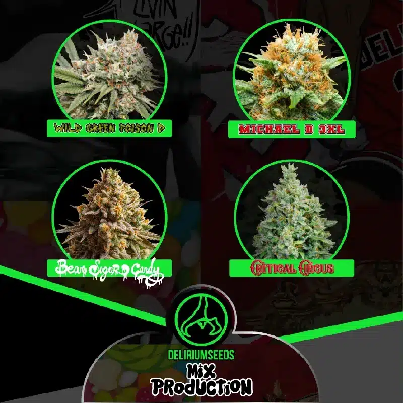 El Mix Production fem de Delirium Seeds es un pack diseñado para quienes buscan máxima producción, vigor, resistencia y diversidad aromática en un solo cultivo. Este conjunto reúne cuatro genéticas élite, seleccionadas por su estabilidad, potencia, rendimiento y perfiles de terpenos intensos. Un pack equilibrado entre índicas y sativas, pensado para cosechas abundantes tanto en interior como en exterior.